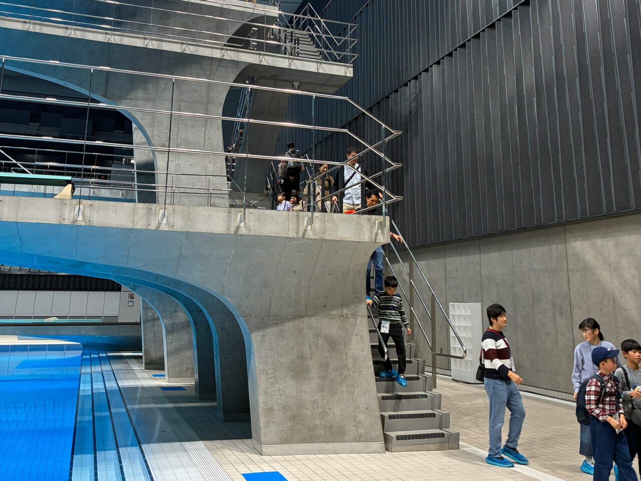 バックヤードツアーでは、歴代のオリンピック選手がナビゲーターとなり、メダル展示エリア、サブプール、マッサージエリア、招集場やダイビングタワーなど、大会の舞台裏を見学させていただきました。また、オリンピアンからは、試合本番直前やインタビューを受ける際の気持ちなど、体験談を聞くことができました。また、ツアーの最後には、決勝レースを観戦し、オリンピック出場経験のある現役選手の泳ぎや演出を楽しみました。