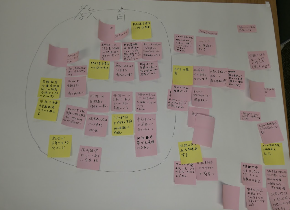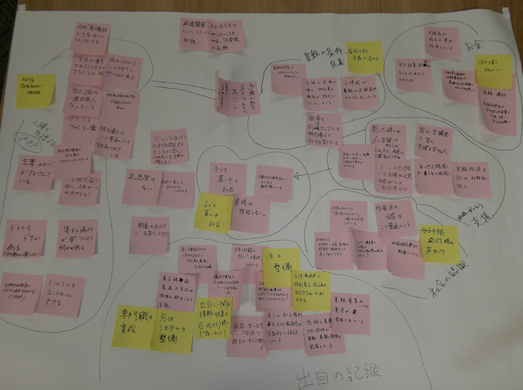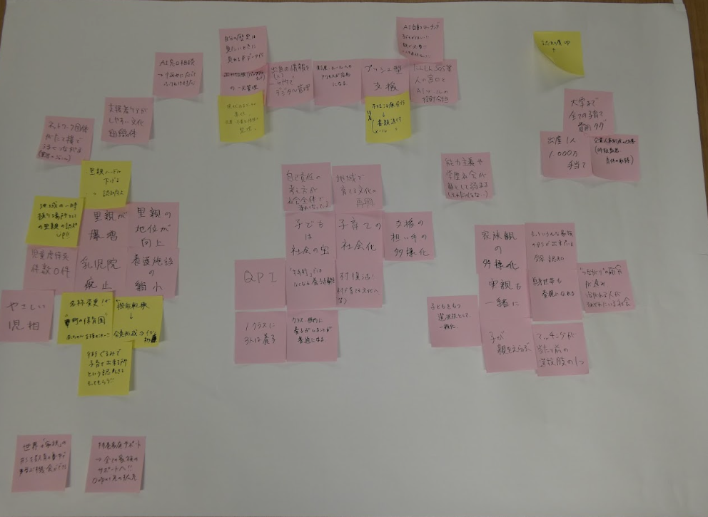 第3部では、参加者同士の意見交換会として、フューチャーデザインの手法を用いたグループワークを実施しました。未来の人間が「今の私たちに何を望むか」を想像し、その声を今日の議論に反映させる仕組みを活用し、2050年の特別養子縁組・周辺領域の世界を想像し、未来を実現するために過去である現在の私たちが取り組むべき事項を考えました。